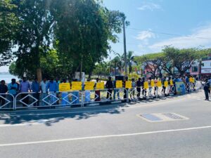 முதலான வாசகங்கள் உள்ளடங்கிய பதாதைகளை ஏந்திய வண்ணம் போராட்டத்தில் ஈடுபட்டனர்.